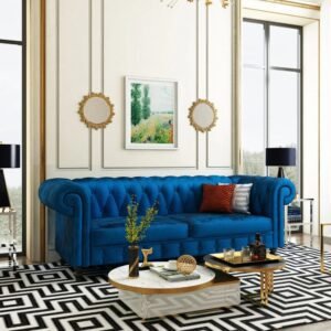 You will not find a sofa that makes a style statement like this royal blue velvet couch. It has a classic Chesterfield design with flared arms that give it a sophisticated, retro look. The back of the sofa has luxurious tufted velvet upholstery. It comfortably sits 3 people and comes with a 1-year manufacturer warranty.
