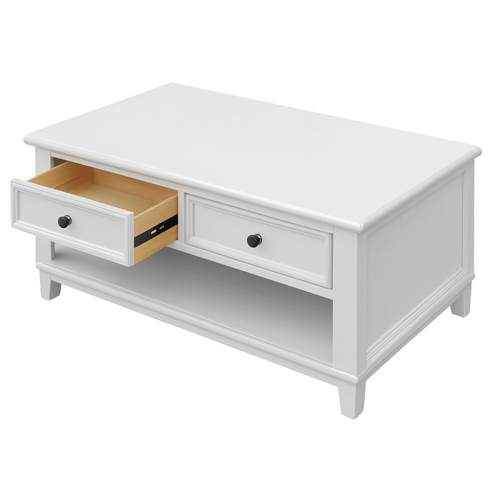 Made with beautiful American ash wood and New Zealand pine, the Hampton coffee table has a country home aesthetic that can fit traditional and contemporary homes. It has 2 drawers for storing the essentials that have decorative bevelled edges and metal handles. It is coated in a neutral matte white paint to complement your decor.