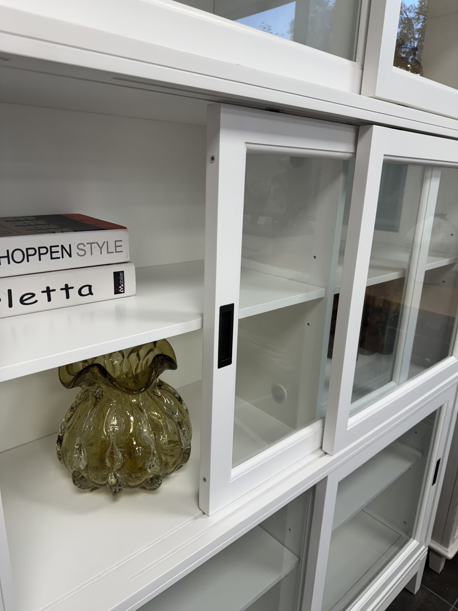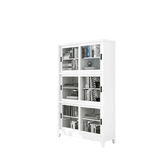 The bookcase is designed with three spacious sections, each enclosed by sliding glass doors that provide a clear view of your cherished items while keeping them dust-free. The glass doors glide smoothly, ensuring easy access to your belongings. Inside, the shelves are thoughtfully arranged to accommodate items of varying sizes—whether you’re showcasing a collection of novels, magazines, or decorative pieces like globes, model ships, or framed photos.