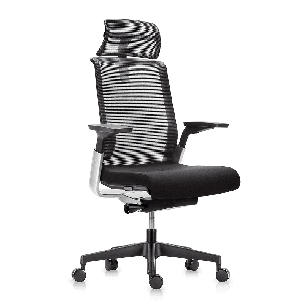 Ergonomic high-back chair with adjustable headrest, 4-way adjustable arms, innovative seat slide, lumbar support, foldable backrest, and durable nylon base. Available in Black or Silver with a 3-year warranty for assured quality.