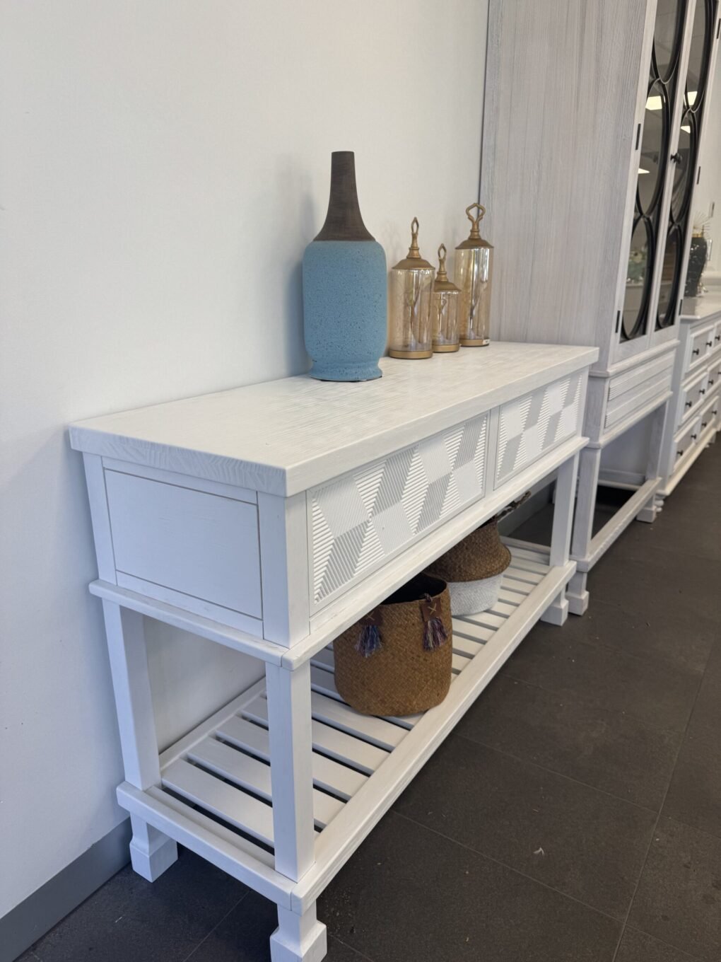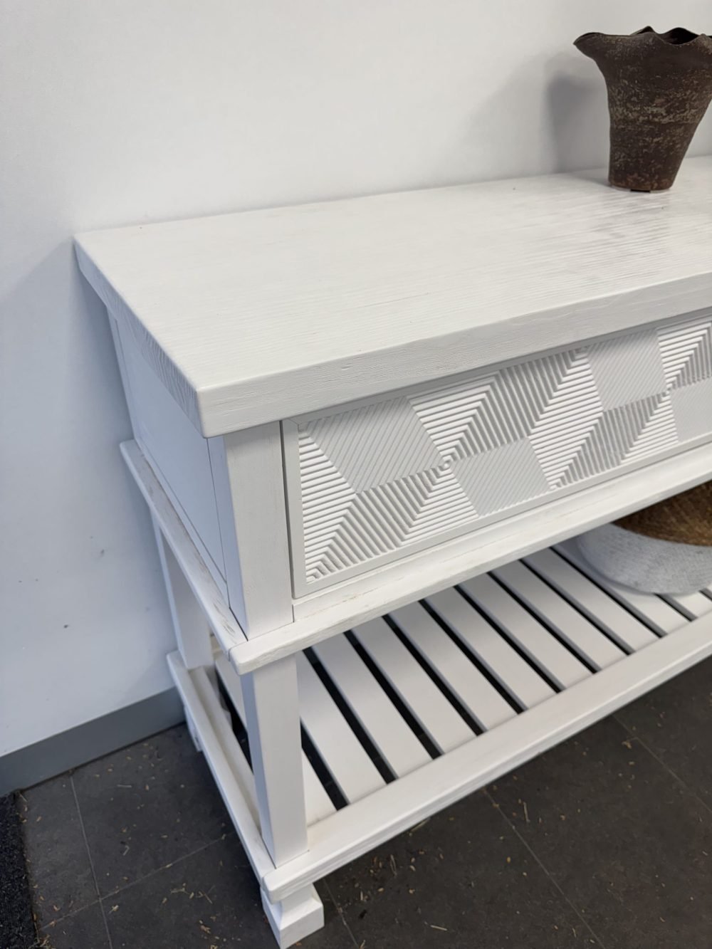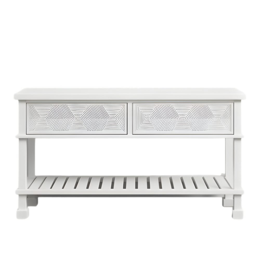 Rustic White Console Table with Geometric Drawer Design, Brushed & Distressed Finish, and Push-to-Open Drawers. Dimension is 143L*42W*87H CM