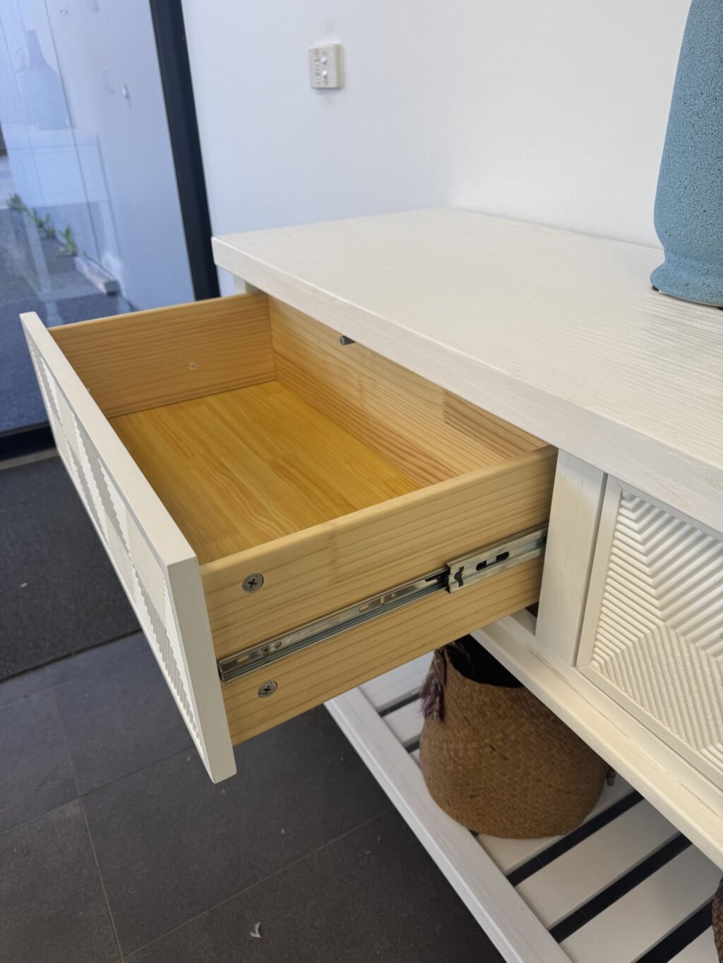 • Push-to-Open Drawers with Geometric Pattern: The two spacious drawers use a convenient push-to-open mechanism, eliminating the need for handles and creating a clean, streamlined appearance. The intricate geometric pattern on the drawer fronts adds a contemporary touch while keeping your essentials organized and within reach.