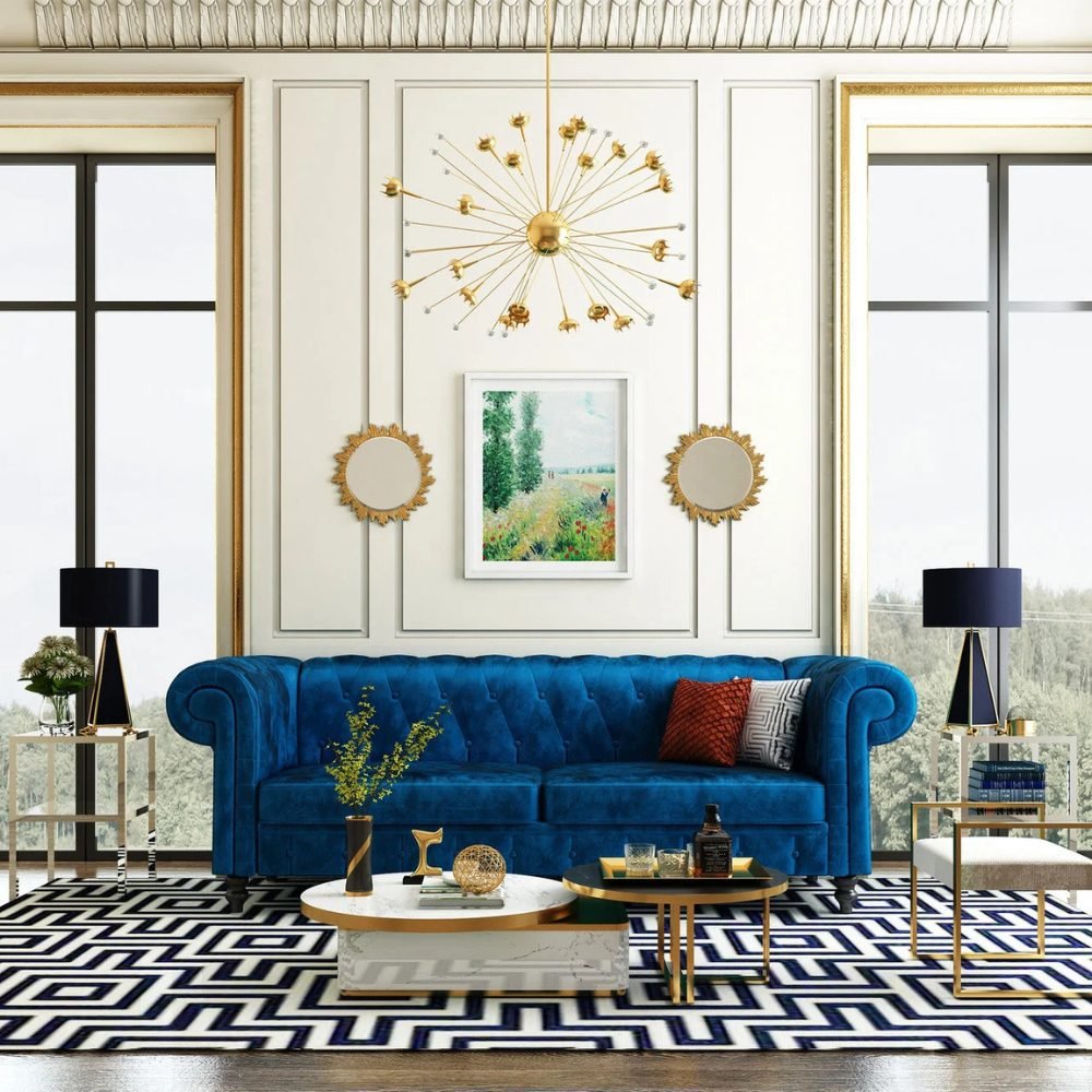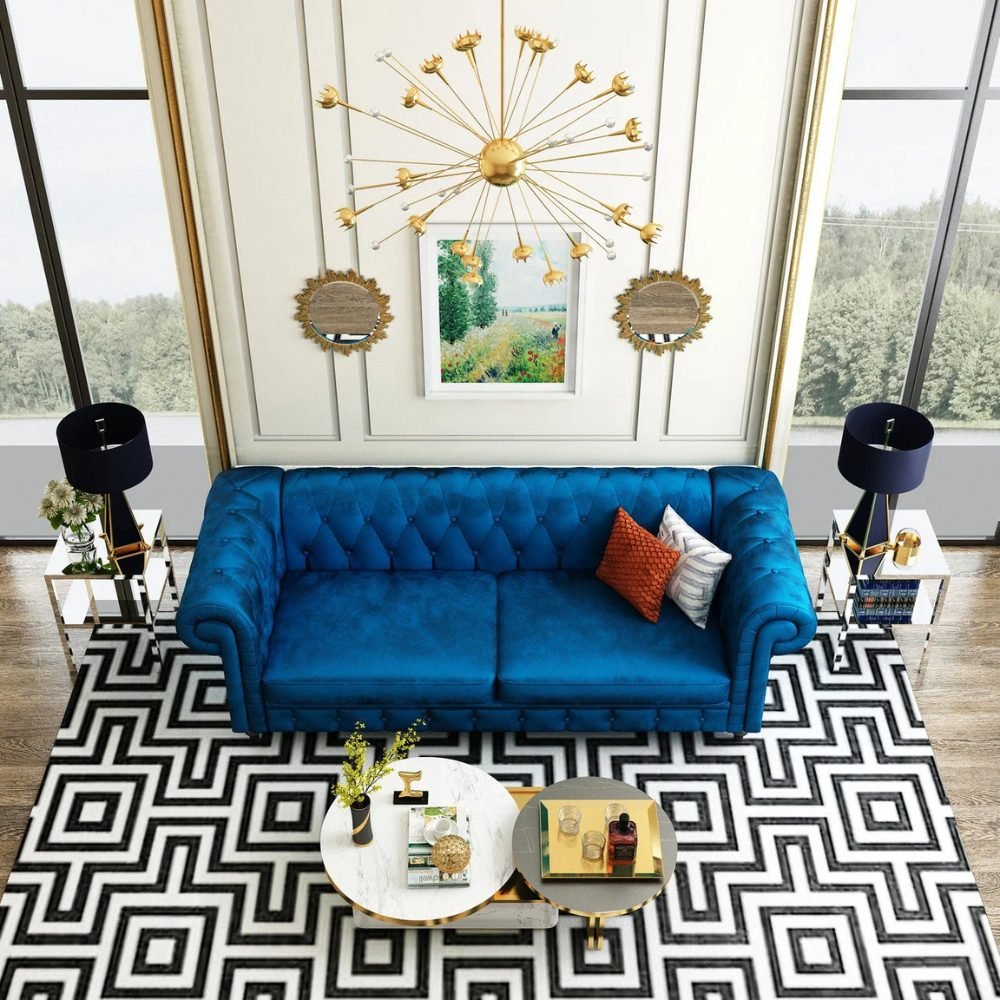 You will not find a sofa that makes a style statement like this royal blue velvet couch. It has a classic Chesterfield design with flared arms that give it a sophisticated, retro look. The back of the sofa has luxurious tufted velvet upholstery. It comfortably sits 3 people and comes with a 1-year manufacturer warranty.